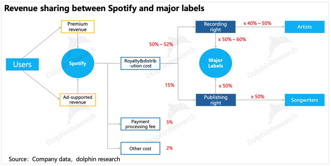但往往三巨頭同時(shí)擁有音頻版權(quán)和代理運(yùn)營(yíng)版權(quán),意味著85%的流媒體收入被放入這些品牌企業(yè)的口袋。音樂(lè)公司和出版商如何在收到85%的流水后與Spotify分享歌手和歌詞作者。簡(jiǎn)而言之,剩下的15%是Spotify自己運(yùn)營(yíng)的所有收入來(lái)源。