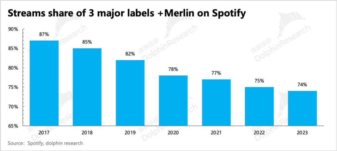 好的,互聯(lián)網(wǎng)平臺(tái)打破了時(shí)間和空間的限制,在推薦系統(tǒng)下,獨(dú)特的音樂(lè)創(chuàng)作可以脫穎而出。因此,越來(lái)越多的獨(dú)立音樂(lè)人的作品(非頭版權(quán)音樂(lè))開(kāi)始活躍起來(lái)。隨著作品制作和發(fā)行的完善(Spotify還推出了獨(dú)立音樂(lè)人發(fā)行平臺(tái)),三大唱片巨頭的市場(chǎng)份額逐漸下降。到2017年,Spotify的播放量占87%,但是現(xiàn)在只有74%。
