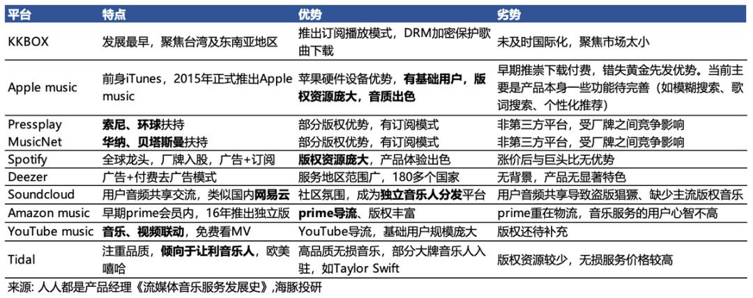 音樂(lè)流媒體發(fā)展初期,更是各式各樣的神仙打架。Pressplay(索尼&環(huán)球)得到了音樂(lè)唱片公司的幫助,并具有版權(quán)優(yōu)勢(shì)、MusicNetiTunes(華納),具有基本客戶優(yōu)勢(shì)。 music(之后是Apple music)、Amazon music、YouTube music,Spotify還有“白手起家”、Deezer、Soundcloud,這20年輪番登場(chǎng)。