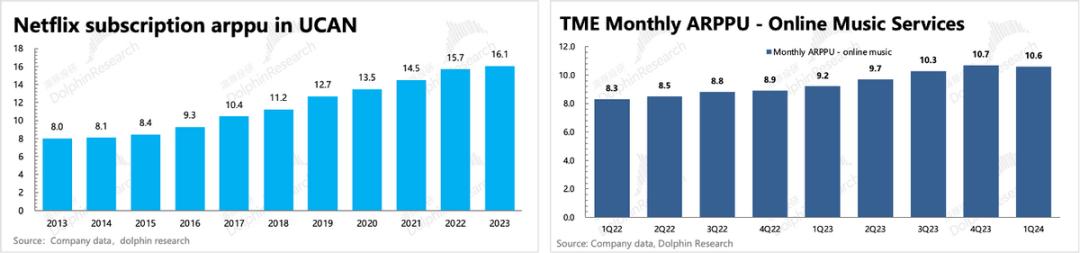 與Netflix和Spotify相比,海豚君發(fā)現(xiàn),在全面進(jìn)入流媒體時(shí)代之后,Netflix也經(jīng)歷了十年的黃金發(fā)展,而Netflix的終端用戶價(jià)格卻遠(yuǎn)遠(yuǎn)超過(guò)了Spotify。