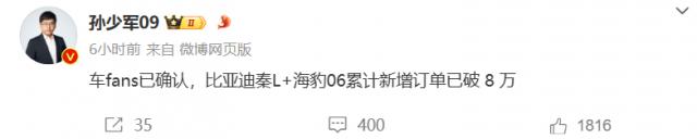 6 月 11 日本,汽車達(dá)人孫少軍發(fā)文稱:這一端午節(jié)比亞迪的新訂單應(yīng)該很爆炸,接著又發(fā)文透露:比亞迪秦 L 和海豹 06 新增訂單的累計(jì)突破 8 萬臺(tái)。這就是新增 8 萬臺(tái),應(yīng)指上市以來新增訂單。