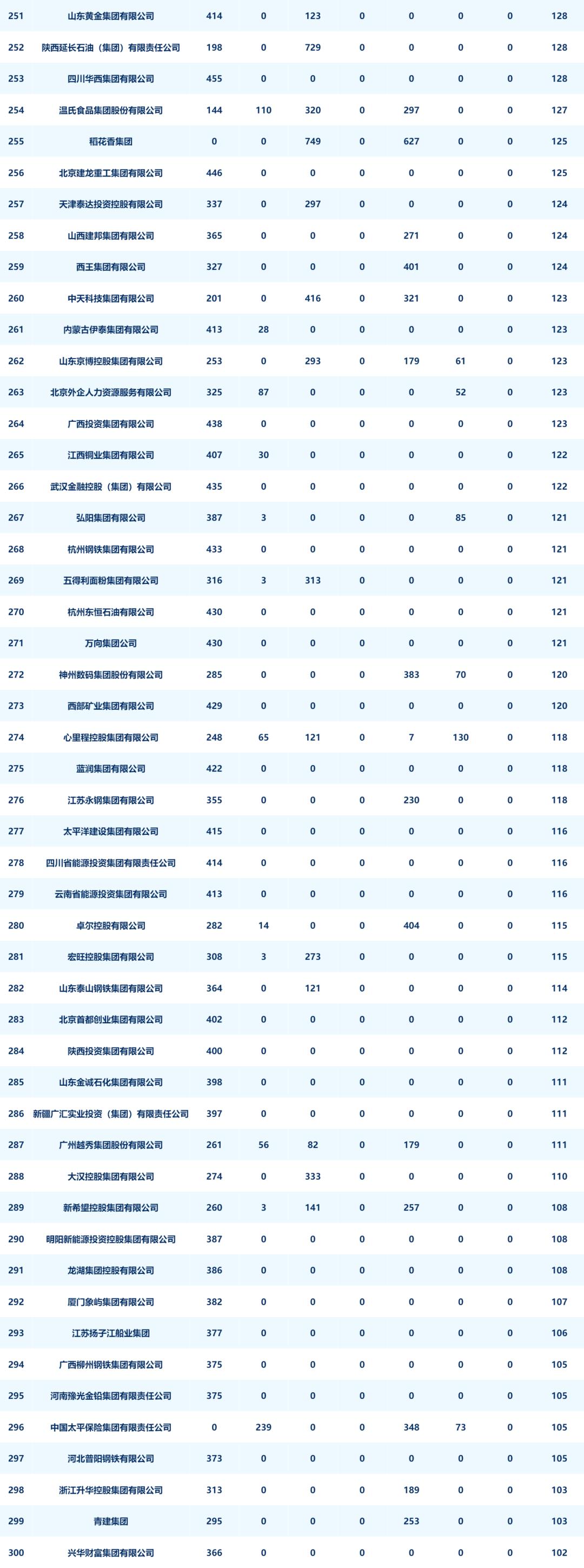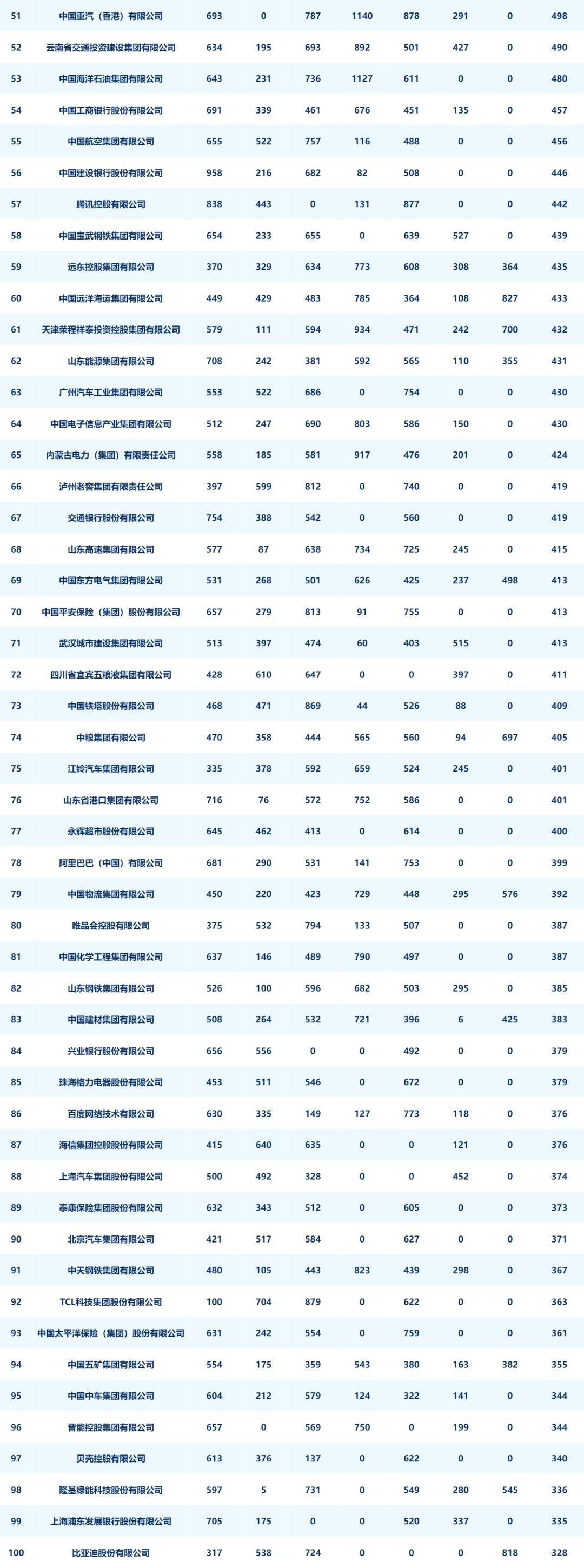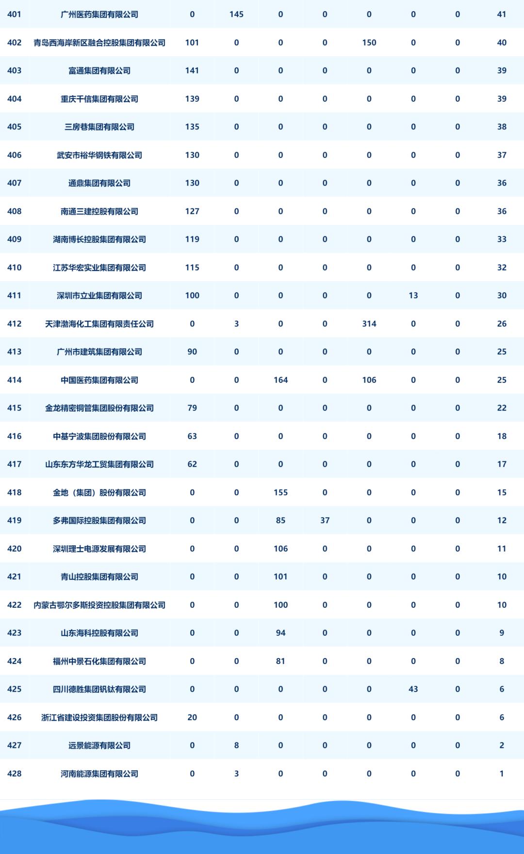 中國移動(dòng)通信集團(tuán)有限公司、中國聯(lián)合網(wǎng)絡(luò)通信集團(tuán)有限公司、中國電信集團(tuán)有限公司、中國石化集團(tuán)有限公司、國家能源投資集團(tuán)有限公司、中國石油天然氣集團(tuán)有限公司、中國核工業(yè)集團(tuán)有限公司、國家電網(wǎng)有限公司、中國能源建設(shè)集團(tuán)有限公司、中國航空工業(yè)集團(tuán)有限公司分別位列前十。