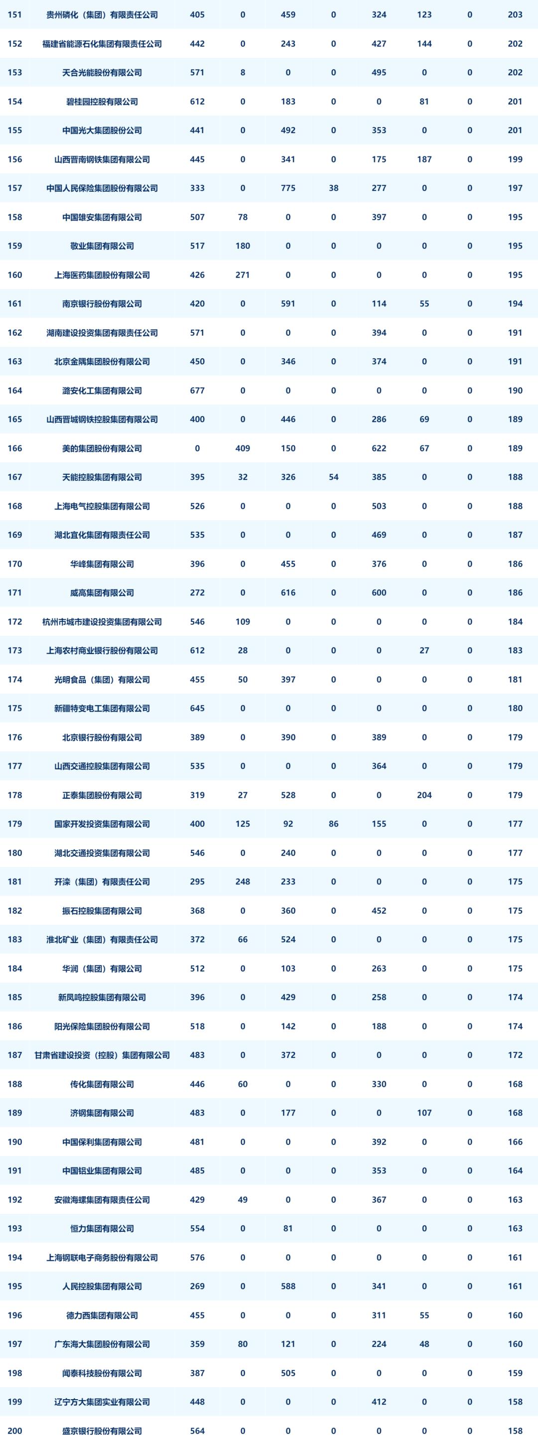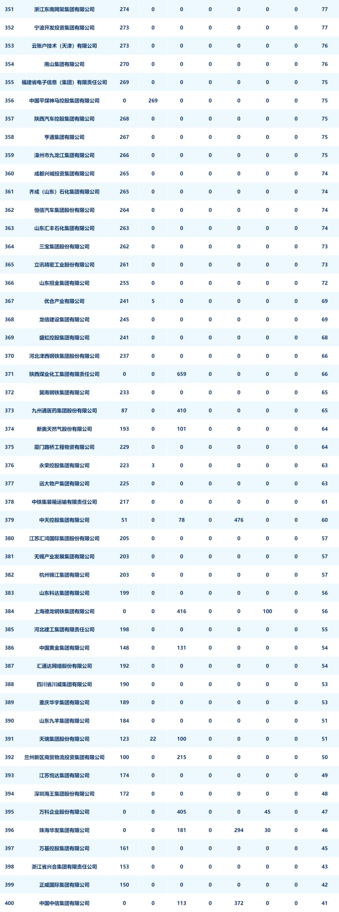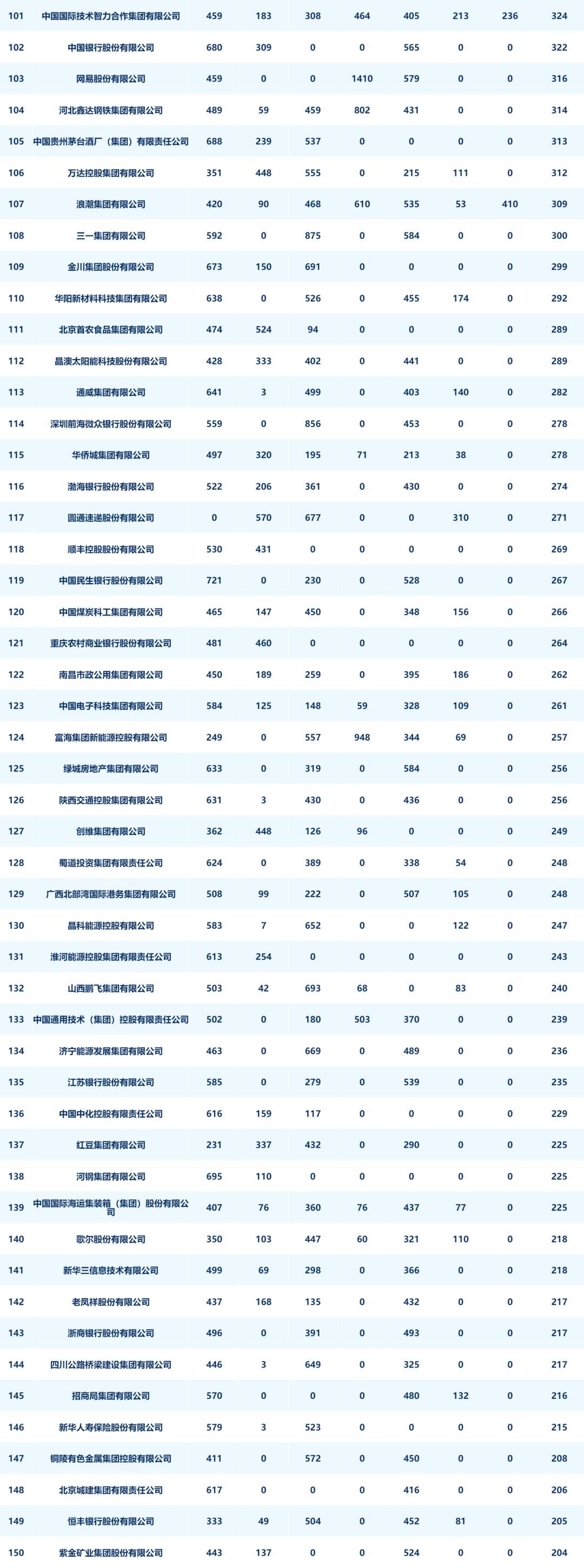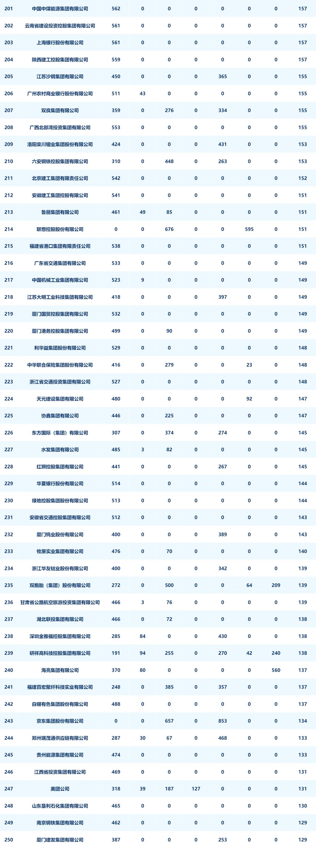 中國移動(dòng)通信集團(tuán)有限公司、中國聯(lián)合網(wǎng)絡(luò)通信集團(tuán)有限公司、中國電信集團(tuán)有限公司、中國石化集團(tuán)有限公司、國家能源投資集團(tuán)有限公司、中國石油天然氣集團(tuán)有限公司、中國核工業(yè)集團(tuán)有限公司、國家電網(wǎng)有限公司、中國能源建設(shè)集團(tuán)有限公司、中國航空工業(yè)集團(tuán)有限公司分別位列前十。