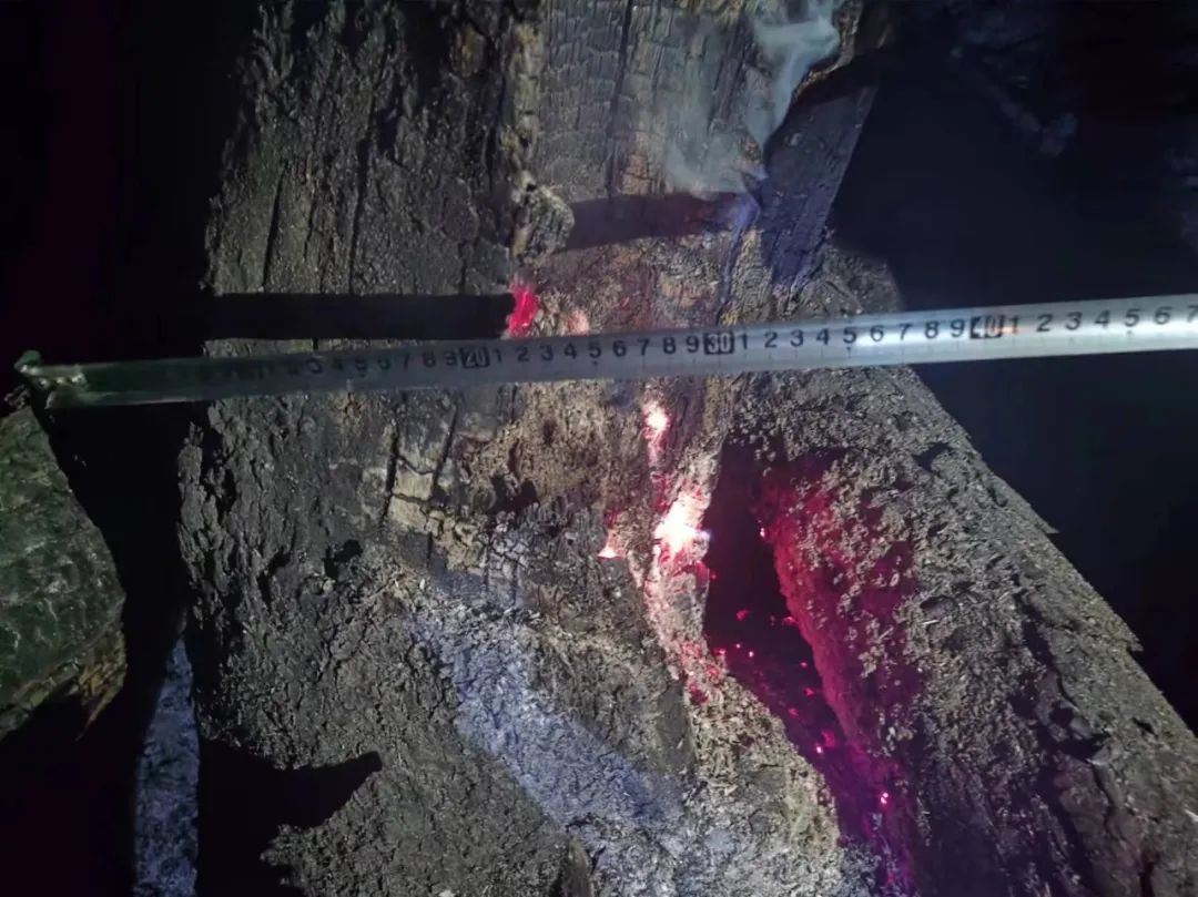 由于火災(zāi)發(fā)生在林地深處,被河流隔離,車輛無法直接到達(dá)現(xiàn)場。警察決定徒步穿越茂密的森林,涉水過河。經(jīng)過精確測量,警方發(fā)現(xiàn)火災(zāi)點與最近的道路仍有近3公里的距離。為了確?;鸢刚{(diào)查工作的高效開展,警方負(fù)重前行,三個多小時后成功到達(dá)火點周圍。由于夜幕降臨,火因調(diào)查組的工作并沒有放緩。警方迅速開展現(xiàn)場勘察工作,仔細(xì)收集火災(zāi)現(xiàn)場周圍的證據(jù),深入分析火勢的傳播方向和速度,探索明火的可能來源。經(jīng)全面調(diào)查,火場周圍沒有野外工作的痕跡,排除了人為因素。22時40分,警方在火災(zāi)中心發(fā)現(xiàn)了一棵活立木(樟子松),樹干上留下了明顯的雷擊劈痕。根據(jù)當(dāng)?shù)馗衫妆┒喟l(fā)的天氣情況,分析判斷火災(zāi)是由雷擊引起的。