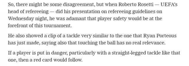 歐足聯(lián)裁判長羅伯托 - 羅塞蒂強調,本屆歐洲杯更注重球員的安全,這是最重要的。球員是否先觸球毫無意義。只要球員的動作能給其他球員造成嚴重的隱性傷害,就可以提供紅牌,尤其是直接鏟球的時候。TA 在這次宣講會上,歐足聯(lián)還展示了一段視頻,犯規(guī)的方式與蘇格蘭球員波蒂厄斯非常相似,所以波蒂厄斯獲得紅牌并不奇怪。此外,犯規(guī)地點在禁區(qū)線附近,點球也是一種合理的懲罰。