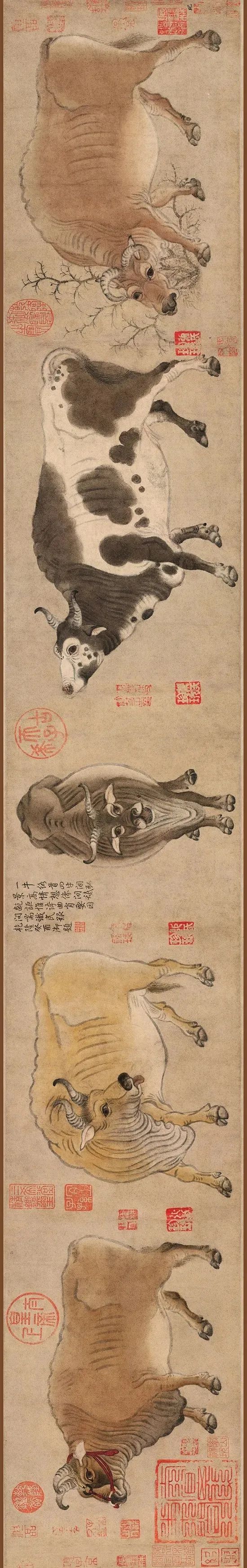 讓我們來(lái)欣賞一下唐朝和韓國(guó)畫的工筆畫《五牛圖》。圖中五牛形象不同,姿勢(shì)各異,要么行動(dòng),要么站立,要么俯首,要么昂首挺胸,充滿動(dòng)感,體現(xiàn)了作者對(duì)生活的微小觀察。正中一頭牛完全畫成正面,視角獨(dú)特,展現(xiàn)了作者精湛的造型能力。作者用簡(jiǎn)潔的線條勾勒出牛骨的轉(zhuǎn)折點(diǎn),筋肉纏繞,筆法成熟流暢,線條強(qiáng)大,藝術(shù)表現(xiàn)準(zhǔn)確。牛頭和口鼻處的根根細(xì)毛,更是筆入微。每頭牛都有明亮的眼睛。通過(guò)對(duì)牛眼的夸張?zhí)幚砗蛯?duì)眼睛的切實(shí)刻畫,作者生動(dòng)地展現(xiàn)了牛溫順倔強(qiáng)的性格,強(qiáng)調(diào)了每頭牛獨(dú)特的性格,使其清晰地展現(xiàn)出不同的表情。造型精準(zhǔn)生動(dòng),色彩清淡簡(jiǎn)約,深淺渲染不同,畫面層次豐富,達(dá)到形神兼?zhèn)涞木辰?,也體現(xiàn)了農(nóng)耕時(shí)代對(duì)牛的崇拜。