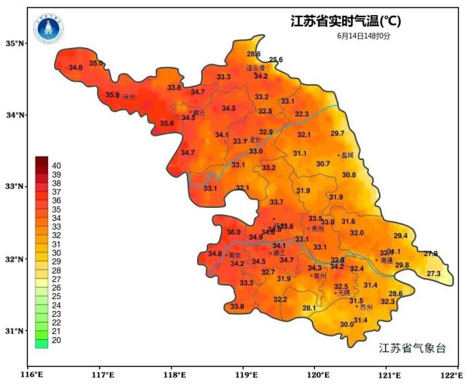 2024年6月14日16時(shí)00分,江蘇省氣象臺(tái)繼續(xù)發(fā)布高溫黃色預(yù)警:預(yù)計(jì)徐州、宿遷、淮安、鹽城、揚(yáng)州、泰州、鎮(zhèn)江、南京北部和南通北部的日最高氣溫將達(dá)到35~37℃。注意預(yù)防。