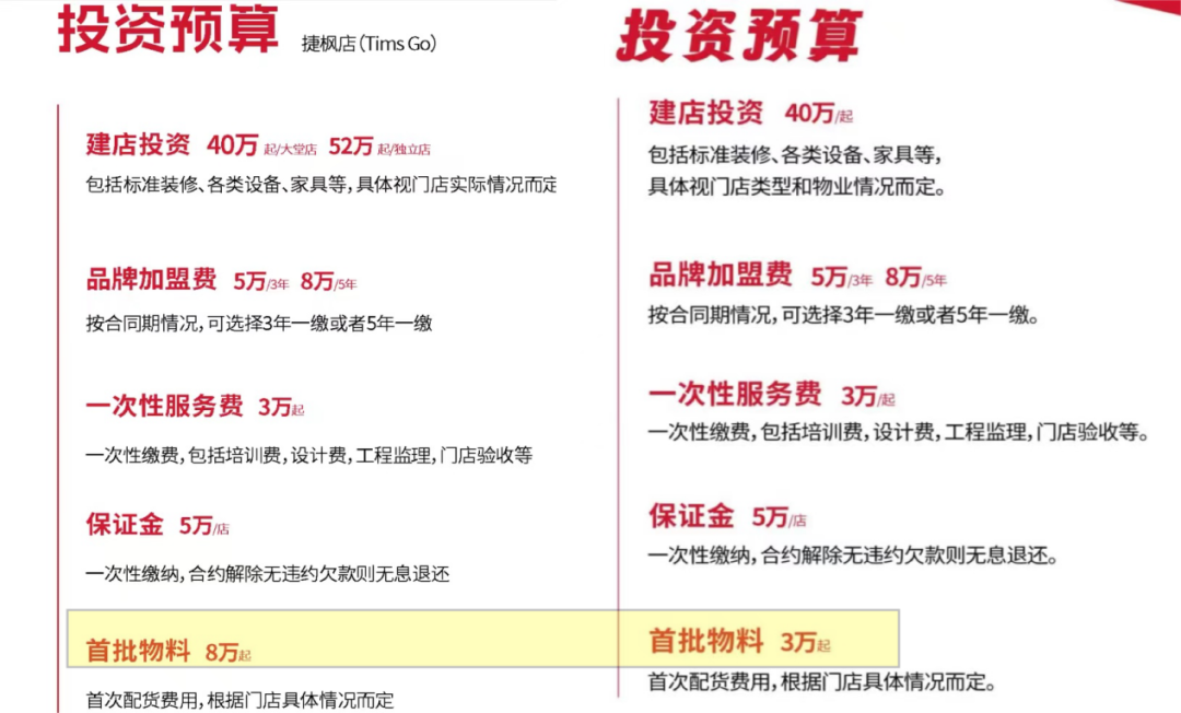 之前加入一家捷楓店,最低大堂店投資40萬(wàn),疊加品牌加盟費(fèi)5萬(wàn)/3年,一次性服務(wù)費(fèi)3萬(wàn)起,保證金5萬(wàn)起,第一批材料費(fèi)8萬(wàn)起,最低61萬(wàn)。