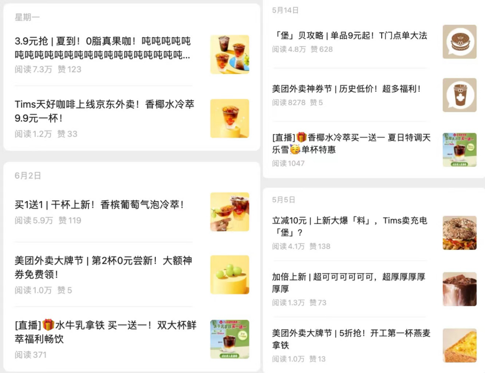 「零售業(yè)財(cái)經(jīng)」觀察到,自2024年以來(lái),特別是4月份以來(lái),Tims天好咖啡官方微信官方賬號(hào)上出現(xiàn)的打折、立減活動(dòng)和“買(mǎi)一送一”文章頻率大幅提升。雖然沒(méi)有“喊口號(hào)”進(jìn)入咖啡價(jià)格戰(zhàn),但似乎“曲線”被打折,以鞏固品牌競(jìng)爭(zhēng)力。