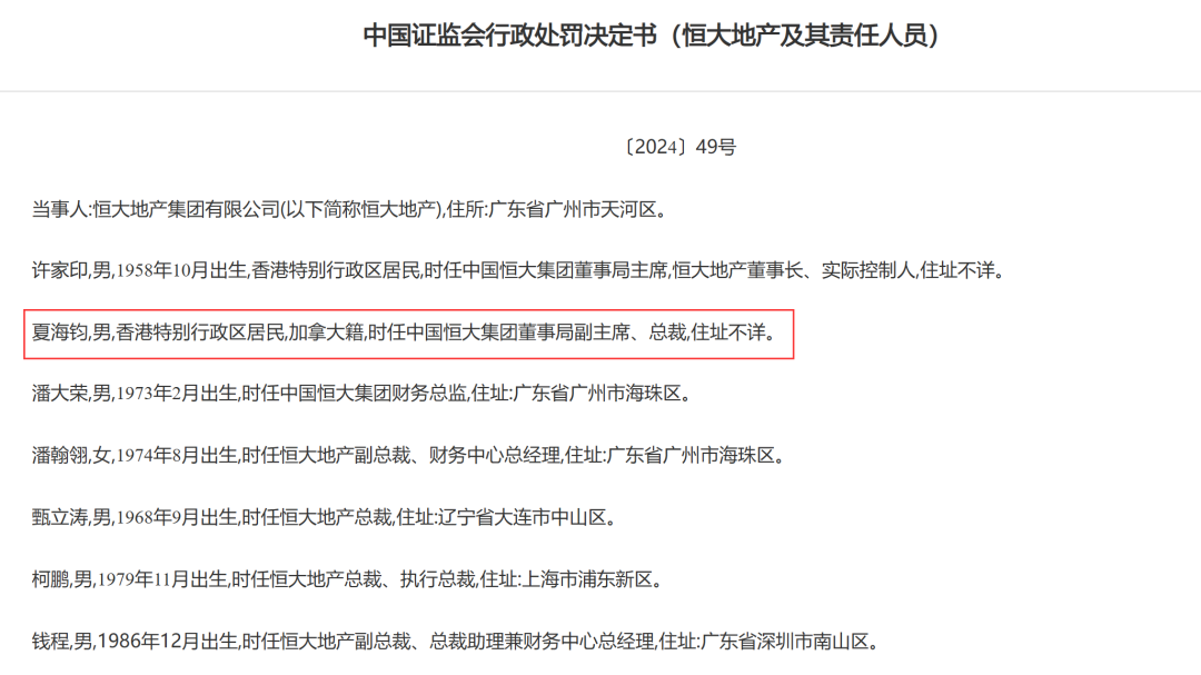 5月21日,中國(guó)證監(jiān)會(huì)正式公布了恒大地產(chǎn)及相關(guān)人員的行政處罰決定,“由于無(wú)法與夏海鈞取得聯(lián)系,已經(jīng)啟動(dòng)了公告交付程序,將依法另行處理”。同時(shí),決定顯示,夏海鈞是香港特別行政區(qū)居民和加拿大人,但地址不明。