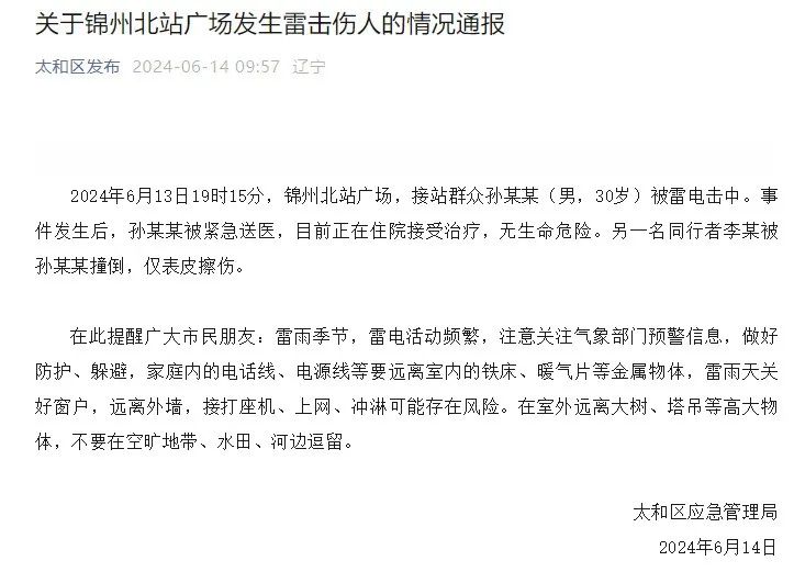 6月13日19時15分,孫某某(男,30歲)在錦州北站廣場被雷電擊中。事件發(fā)生后,孫某某被緊急送往醫(yī)院,現(xiàn)在正在住院治療,沒有生命危險。另一名同事李某某被孫某某撞倒,只是表皮擦傷。