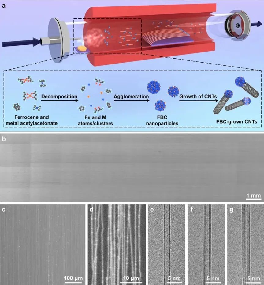 但長(zhǎng)碳納米管的生長(zhǎng)是數(shù)百億個(gè)原子的自組裝,條件苛刻,容錯(cuò)率低,導(dǎo)致產(chǎn)量低,陣型密度一般不到50個(gè)。 mm–第一,應(yīng)用開發(fā)過程受到嚴(yán)重限制。在初期基礎(chǔ)阻攔導(dǎo)向策略的基礎(chǔ)上,張如范研究組進(jìn)一步提出了浮游雙金屬催化劑(FBCs)原點(diǎn)氣合成方法(圖1)。該研究的特點(diǎn)是將二茂鐵和乙酰丙酮鹽同時(shí)放入反應(yīng)釜入口,分別作為鐵和二金屬前驅(qū)體。由于乙酰丙酮鹽種類繁多,具有易于提高的特點(diǎn),從而為二元合金浮游催化劑的產(chǎn)生創(chuàng)造了條件。