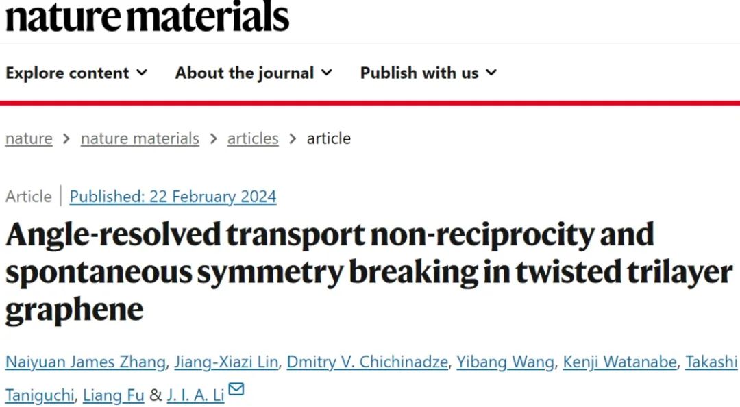 以“相關(guān)研究成果”Angle-resolved transport non-reciprocity and spontaneous symmetry breaking in twisted trilayer graphene"問題發(fā)表于《Nature Materials》。