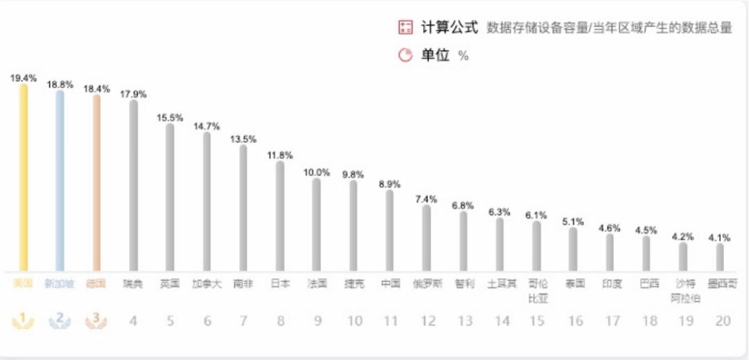 通過計算一個國家的數(shù)據(jù)存儲容量,除以一個國家的總數(shù)據(jù)產(chǎn)值,可以反映一個國家和地區(qū)最初生產(chǎn)的所有信息中存儲的比例有多大,從而反映一個國家的數(shù)據(jù)存儲能力是否足以支撐其經(jīng)濟(jì)社會的高質(zhì)量發(fā)展需求。