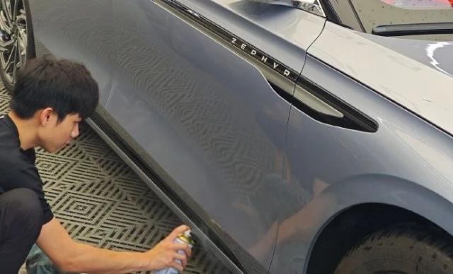 為了掩蓋這些痕跡,車主想貼啞光車衣,但是他猶豫了一下貼出來的效果,所以我們當(dāng)場給車主貼了一小塊,看看效果。