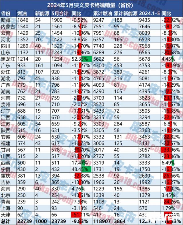 5 每月最新發(fā)布國內(nèi)皮卡終端銷量。2024 年 5 月度狹義皮卡終端銷量為 23739 與去年相比,車輛同比下降 9.83%。乘用車市場的殘酷競爭仍然影響著皮卡市場的下跌。皮卡市場的競爭也會(huì)變得異常激烈。本月新能源皮卡再次上漲,本月銷量達(dá)到 1 同比增長的千臺(tái) 15.34%。
