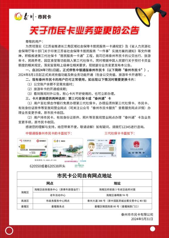 中銀通版泰州市民卡正式停售。