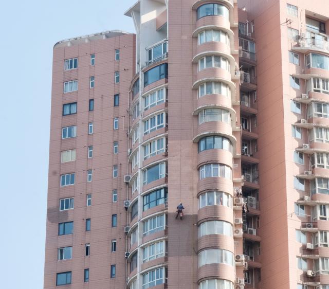 這個(gè)工人,在冬天的寒風(fēng)中,只掛著一根細(xì)長(zhǎng)的安全繩,掛在高空清潔外立面。