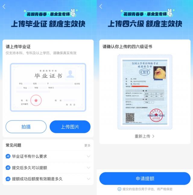 上傳畢業(yè)證書,四六級證書,花唄可提額