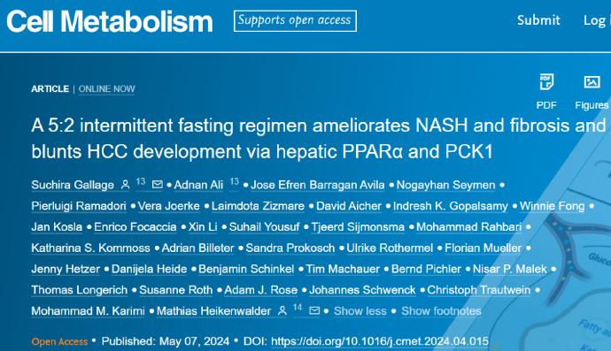 [1]Gallage S, et al. A 5:2 intermittent fasting regimen ameliorates NASH and fibrosis and blunts HCC development via hepatic PPARα and PCK1. Cell Metab. 2024 May 2:S1550-4131(24)00135-9. doi: 10.1016/j.cmet.2024.04.015. Epub ahead of print. PMID: 38718791.