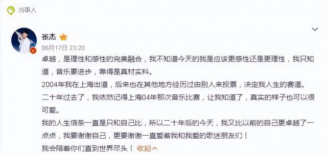 對于這一點,歌星張杰在 6 月 17 日 23 點 20 發(fā)帖,信息量很大,他表現(xiàn)出了自己最好的態(tài)度。