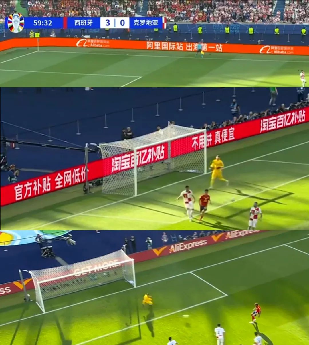 舉個(gè)簡(jiǎn)單的例子:6月16日,在西班牙對(duì)陣克羅地亞的比賽第60分鐘,克羅地亞持球進(jìn)攻,西班牙所有后衛(wèi)都拼命追趕。這時(shí),在直播的主機(jī)位鏡頭中,場(chǎng)邊的LED廣告牌上顯示了黑色和金色「螞蟻財(cái)富黑卡」廣告。但是當(dāng)我回頭看鏡頭的時(shí)候,同時(shí),場(chǎng)邊的廣告牌變成了淺藍(lán)色?!窤lipay 」廣告。