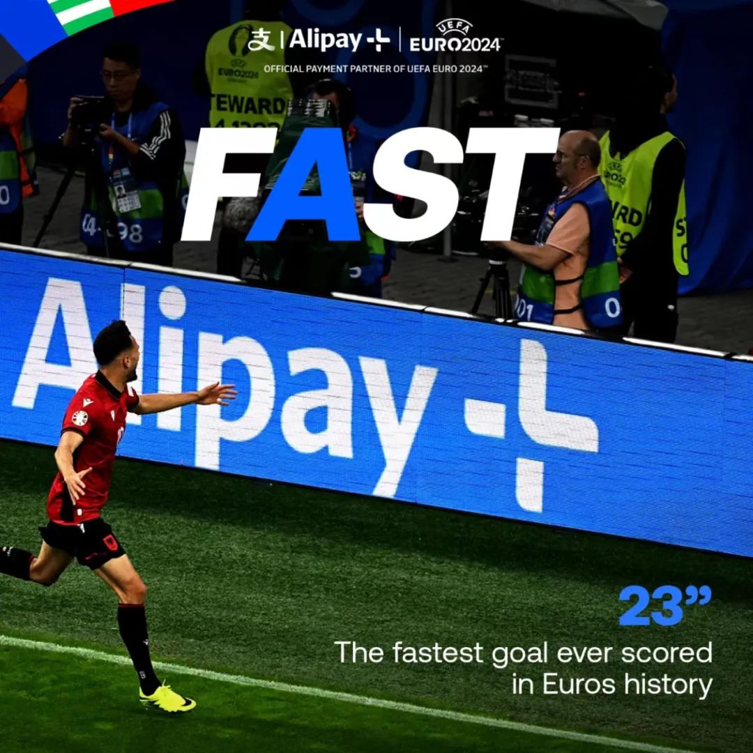 當(dāng)歐洲杯歷史上最快的進(jìn)球記錄誕生時(shí),現(xiàn)場(chǎng)LED顯示的是Alipay。 的場(chǎng)景