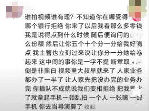 6月18日下午,儲戶再次發(fā)布視頻,稱視頻中的柜員與她競爭,沒有意識到自己的錯誤。他在這里留言說:“誰拍視頻合理?你們來了之后,我看了那么多零錢,我說到了什么時候,然后讓你們五、十分一分,給我好清點。我的主管也馬上過來讓你分一分,她把它卷起來。這個中間的事情你一字不提,以偏概全,顛倒是非黑白。視頻中,大叔已經(jīng)來了,其他業(yè)務(wù)已經(jīng)做了一半。讓人們先把沒做好的生意做好。如果你排隊失敗,你會說我們會變相拒絕。如果你生氣了,你會拿起手機亂拍。一個人,一張嘴,一部手機,你可以當導演?!?/p>