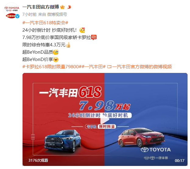 6月18日, 一汽豐田宣布在其官方微上,主要銷(xiāo)售力量—— 卡羅拉車(chē)型實(shí)行限時(shí)綜合優(yōu)惠措施,優(yōu)惠金額達(dá)43,000元,價(jià)格低至80,000元。。一汽豐田在給予大幅折扣的同時(shí),也不忘“內(nèi)涵”比亞迪。