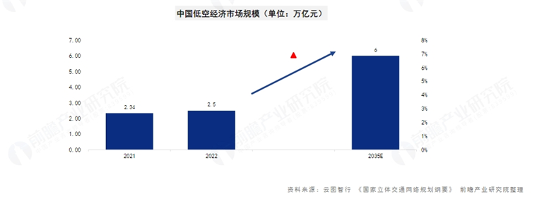 在“十四五”規(guī)劃發(fā)布的《國(guó)家立體交通網(wǎng)絡(luò)規(guī)劃綱要》中,明確了整個(gè)低空經(jīng)濟(jì)市場(chǎng)的未來(lái)發(fā)展。到2035年,中國(guó)支持經(jīng)濟(jì)發(fā)展的商用和工業(yè)無(wú)人機(jī)預(yù)計(jì)將達(dá)到2600萬(wàn)架,同期無(wú)人機(jī)駕駛員數(shù)量將增加到63萬(wàn)架。到2035年,預(yù)計(jì)中國(guó)低空經(jīng)濟(jì)產(chǎn)業(yè)規(guī)模將超過(guò)6萬(wàn)億元,年復(fù)合增長(zhǎng)率將達(dá)到7.6%,可見(jiàn)發(fā)展前景非??捎^。
