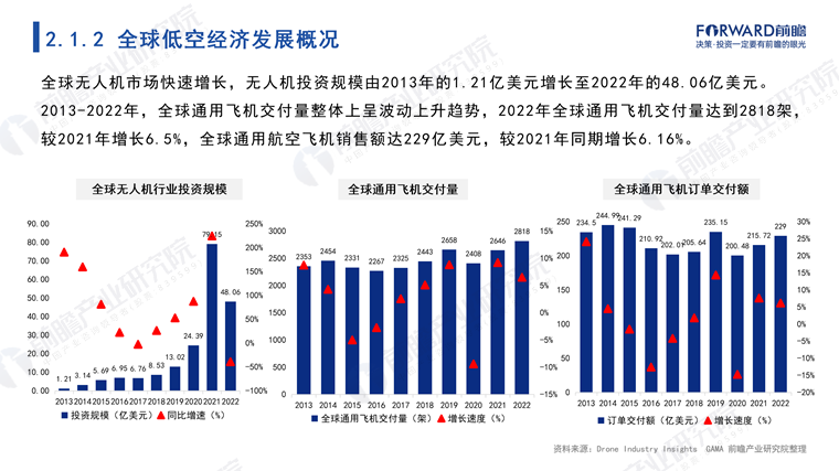 根據(jù)前瞻性產(chǎn)業(yè)研究院《2024年中國(guó)低空經(jīng)濟(jì)報(bào)告》的數(shù)據(jù),截至2023年底,從全球低空經(jīng)濟(jì)區(qū)域發(fā)展格局來(lái)看,由于通用航空發(fā)展的領(lǐng)先地位,美國(guó)確立了低空經(jīng)濟(jì)的先發(fā)優(yōu)勢(shì)。相比之下,中國(guó)在無(wú)人機(jī)領(lǐng)域有可能與美國(guó)競(jìng)爭(zhēng)。因此,發(fā)展低空經(jīng)濟(jì)有利于中國(guó)在航空領(lǐng)域?qū)崿F(xiàn)彎道超車。