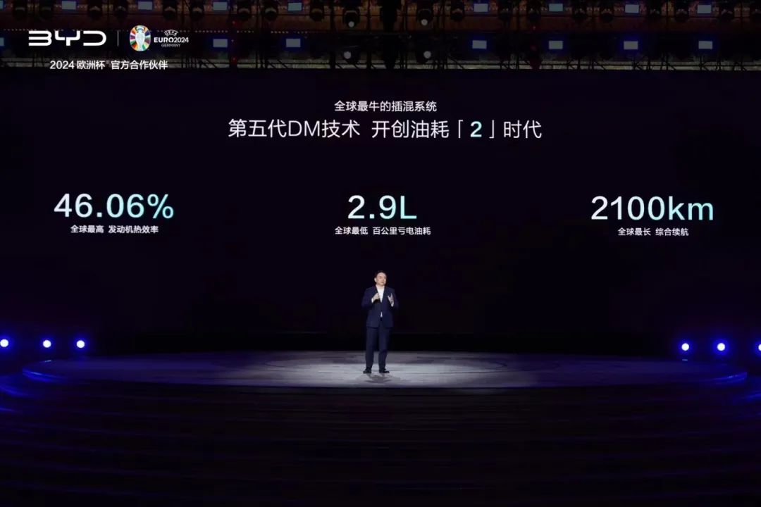 首先,第五代DM技術(shù)“全球最高發(fā)動(dòng)機(jī)熱效率46.06%”、全球最低100公里缺電油耗2.9L、“全球最長(zhǎng)綜合續(xù)航2100公里”的概念搬上了舞臺(tái)大說(shuō)特說(shuō)。
