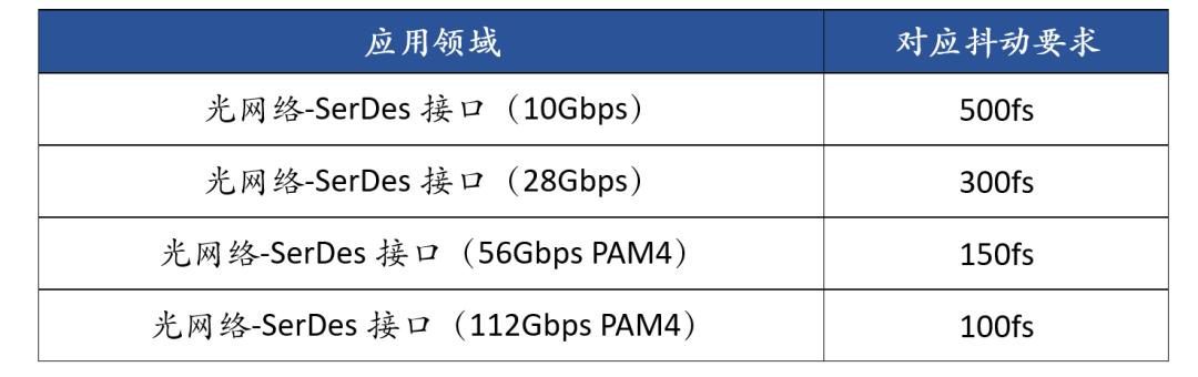 去抖時鐘的性能要求與數(shù)據(jù)傳輸速率高度有關(guān)。例如,當(dāng)SerDes接口的傳輸速度為10Gbps時,鐘信號的抖動只需達(dá)到500fs-1000fs。;當(dāng)傳輸速度提高到112Gbps時,時鐘信號要求提高到100fs。通信基礎(chǔ)設(shè)施,如5G通信基站、AI數(shù)據(jù)中心等,都需要抖時鐘保證符合5G等高速通信要求。不同的應(yīng)用領(lǐng)域?qū)r鐘導(dǎo)出抖動有不同的要求。消費產(chǎn)品只需要3ps,基站需要100fs,要求最高,所以ic設(shè)計也是最難的。