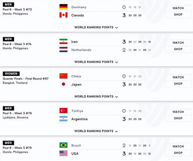 這一輪阿根廷男排 3-0 狂掃土耳其男排,三局比分分為 25-17、25-18 和 25-20。加拿大男排 3-0 三局比分分為三局的德國男排。 25-19、25-18、25-21。