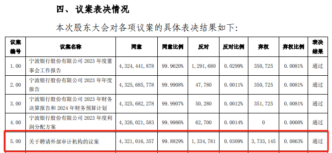 五月十五日,寧波銀行召開(kāi)了2023年度股東大會(huì),其中包括《關(guān)于聘用外部審計(jì)機(jī)構(gòu)的議案》。