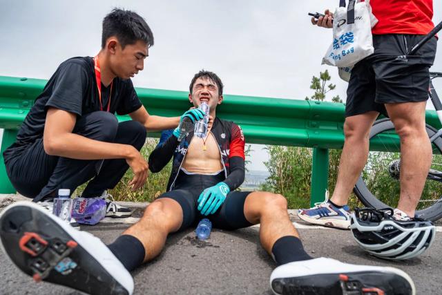 隊友張一航拼到筋疲力盡。道路大組賽在全國比賽中一直被稱為“個人比賽”,但這從來都不是一個只有個人才能成功的比賽。