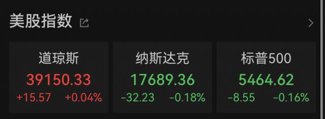 在收盤時,道指上漲 0.04% 報 39150.33 點,標普 500 指數(shù)跌 0.16% 報 5464.62 點,納指跌 0.18% 報 17689.36 點。