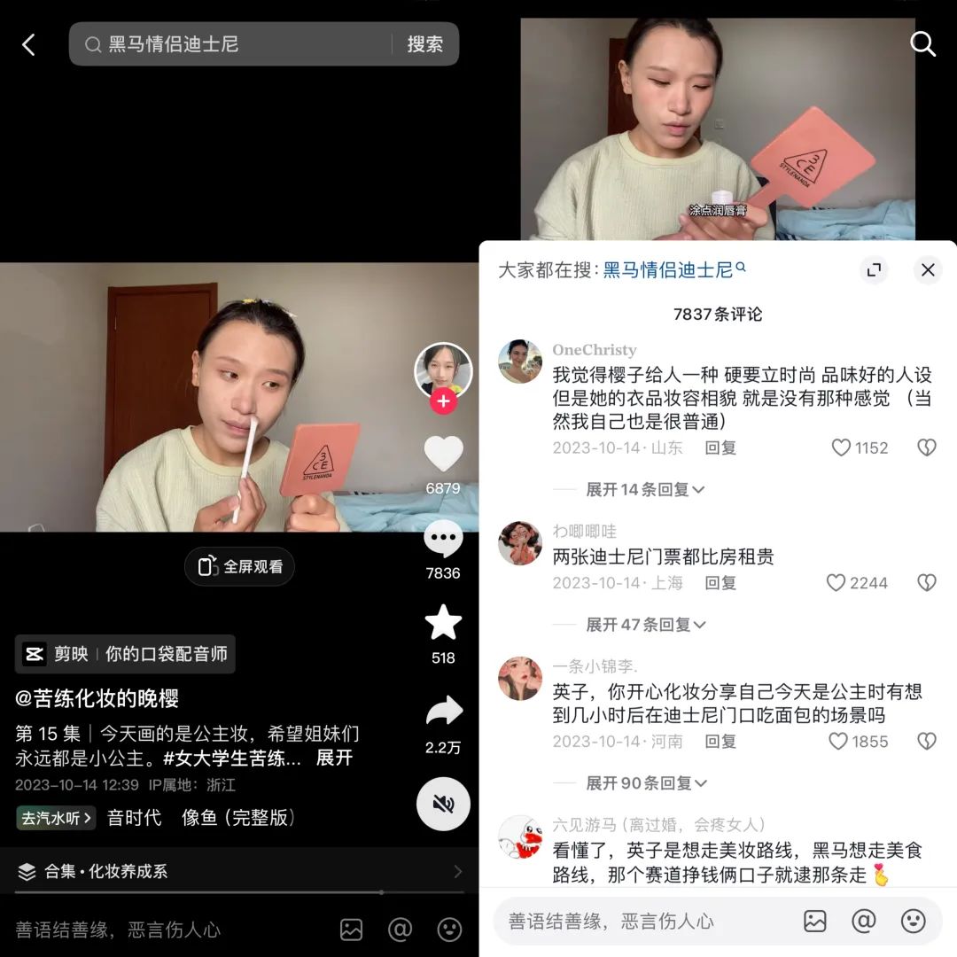 就帳號類型而言,@苦練化妝的晚櫻 聚焦美妝,她發(fā)布了很多視頻,比如《迪士尼公主妝》《沉浸式化妝》《化妝前護(hù)膚小技巧》,但從評論區(qū)來看,她的評論并沒有好轉(zhuǎn),網(wǎng)友也不買她的審美和化妝技巧。