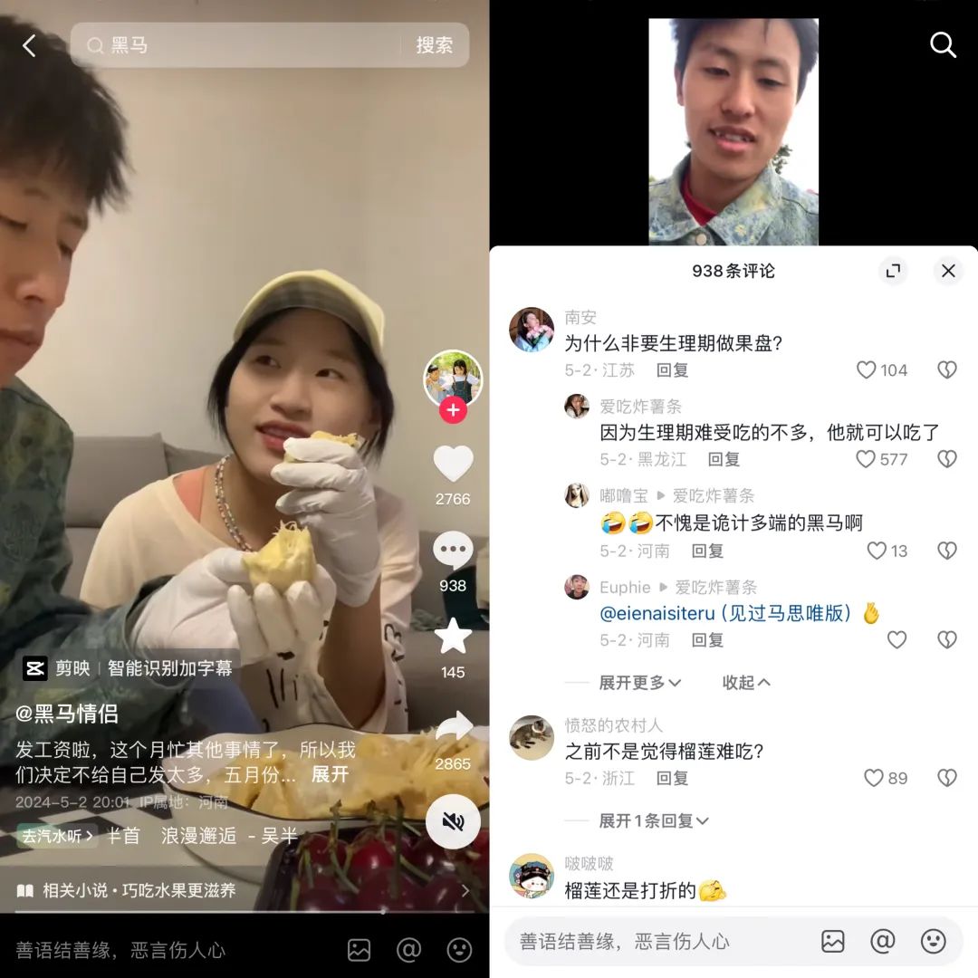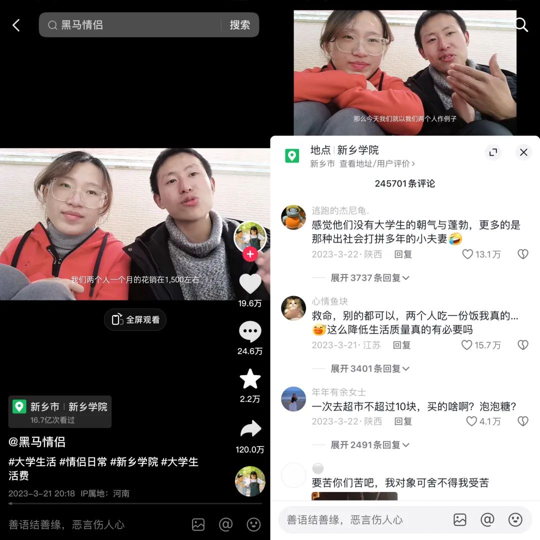 @黑馬戀人 最受詬病的地方是他們極致的“省錢法”,其中最典型的視頻是“大學(xué)談戀愛一個月能花多少錢?”視頻中,黑馬(男)非常自豪地告訴網(wǎng)友,他們兩個一個月的開銷在1500左右,他們迫不及待地想把一分錢掰成兩半。