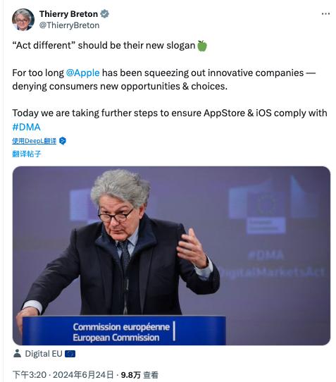 對于這一點,歐盟專家負責數(shù)字市場 Thierry Breton 在 X 上表示: