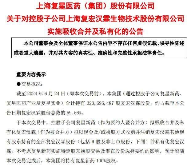 公告顯示,復(fù)星制藥控股子公司復(fù)星制藥與另一家控股子公司復(fù)宏漢霖簽署了《吸收合并協(xié)議》。同日,控股子公司復(fù)星制藥、復(fù)星制藥行業(yè)、復(fù)星產(chǎn)業(yè)聯(lián)合簽署《存續(xù)協(xié)議》。根據(jù)上述協(xié)議,復(fù)星新藥計劃以現(xiàn)金和換股方式收購并注銷目前股東持有的復(fù)宏漢霖全部股權(quán) ( 包含 H 股票和未上市的股票,相同 ) ,并且私有化復(fù)宏漢霖。