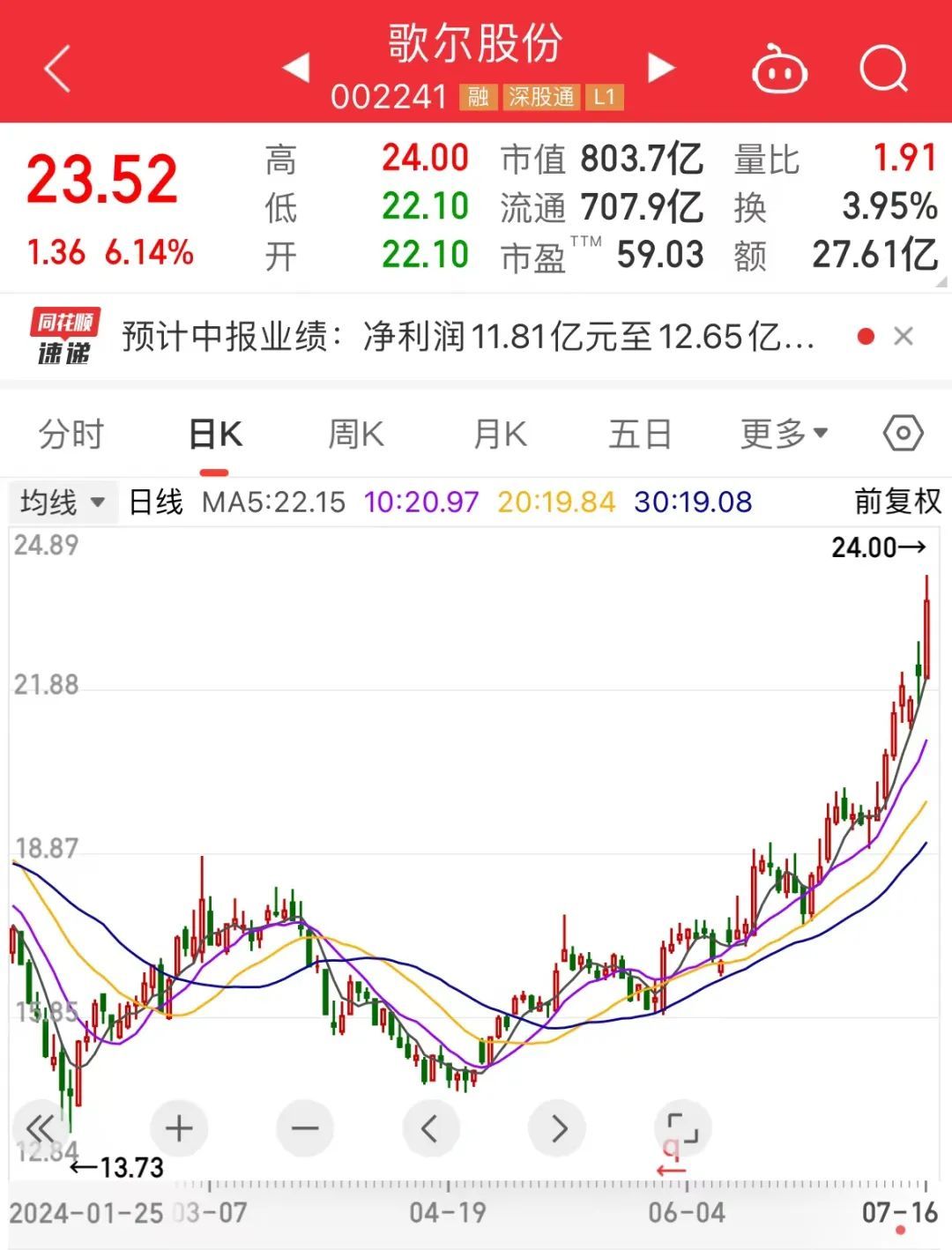 7月16日開盤,歌爾股權(quán)盤中漲幅超過8%,創(chuàng)過去一年新高,a股市值突破800億元。與年內(nèi)低點(diǎn)相比,該股最大反彈幅度已達(dá)70%以上。