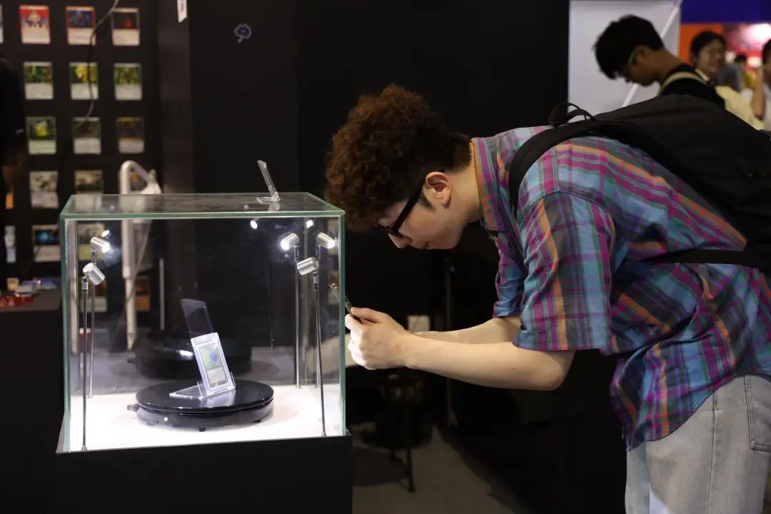 本次展覽的亮點(diǎn)之一是展出了許多引人注目的萬智品牌藝術(shù)品,包括傳奇卡片《黑蓮花》,以及與熱門IP跨境營(yíng)銷的卡片,如街頭霸王、小馬寶莉、博德之門等。觀眾只需要拍展品或者參加合影打卡,就可以獲得一個(gè)限量版的主題貼紙或者一個(gè)精致的骰子。這種收藏和樂趣并存的方式很受玩家的歡迎。