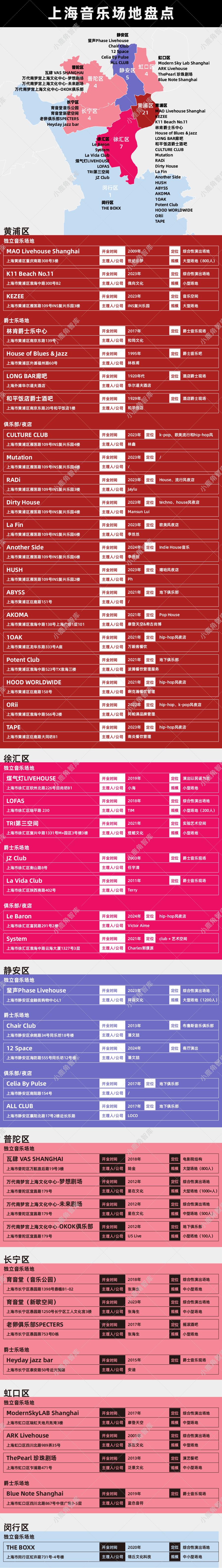 隨著人們消費(fèi)習(xí)慣和精神需求的不斷提高,上海的現(xiàn)場音樂消費(fèi)模式一路走高。到目前為止,上海已經(jīng)有40多個(gè)不同音樂場景的表演場所。只是音樂財(cái)經(jīng)(ID:musicbusiness)盤點(diǎn)的綜合音樂場所有18個(gè),其中大型場所有5個(gè),中小型場所有13個(gè);爵士和布魯斯音樂場景的垂直領(lǐng)域有10個(gè)場地;魔都電子音樂文化發(fā)達(dá),到處都是潮流。據(jù)不完全統(tǒng)計(jì),上海有18個(gè)CLUB。