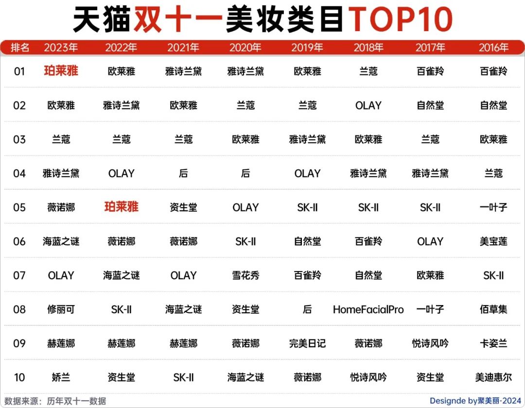 與此同時(shí),在大單品策略的推動(dòng)下,珀萊雅近年來(lái)的銷(xiāo)量迅速飆升,直到2023年雙11超越歐萊雅登頂天貓美妝品類(lèi)Top1,并于今年618再次登頂。