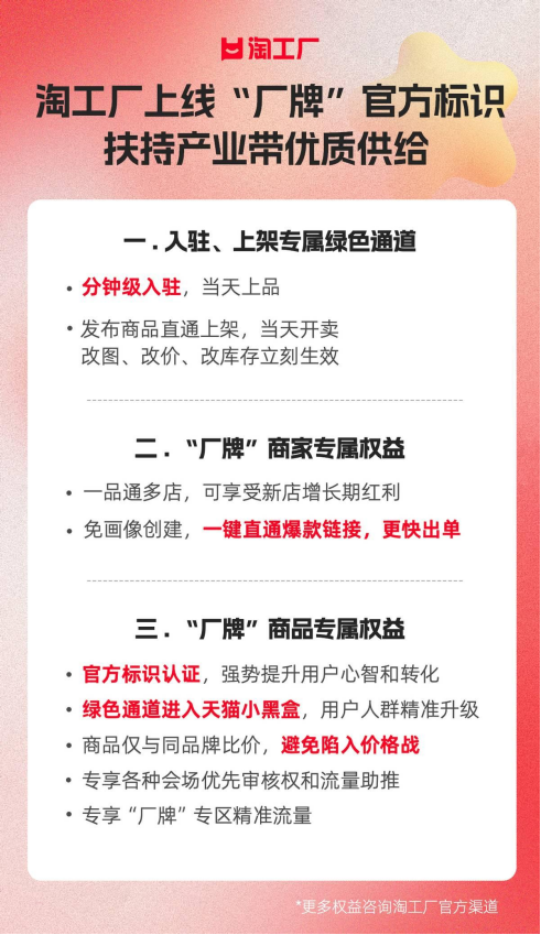 “品牌”認(rèn)證服務(wù)代表著淘廠將為符合特定標(biāo)準(zhǔn)的優(yōu)質(zhì)供應(yīng)打上官方背書的“品牌”標(biāo)志,這些廠商將享有一系列專屬權(quán)益。