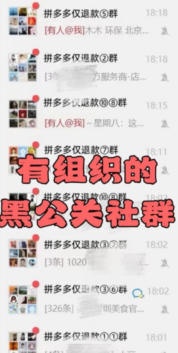 在馬克提供的幾張截圖中,有一張是關(guān)于“拼多多只有退款群”的。根據(jù)數(shù)據(jù)推斷,馬克至少加入了幾十個(gè)類似的群體。