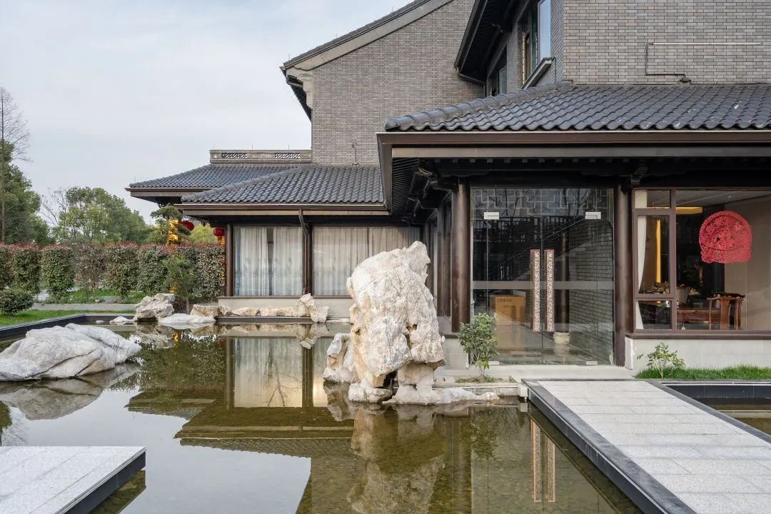 酒店本身的建筑風格是徽派的灰瓦白墻。酒店被水景、樹木、溪流、游泳池包圍著。據(jù)說你在里面會覺得自己在湘湖的一個景點。