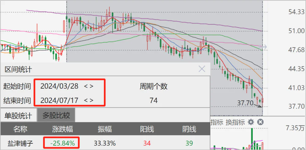 三月二十八日妙投發(fā)布了《鹽津店,最后的“狂歡”》,到目前為止,鹽津店已經(jīng)如期下跌了25%以上。特別是上周三(7月10日)預(yù)先披露2024年上半年業(yè)績(jī)后,股價(jià)連續(xù)三天加速下跌。