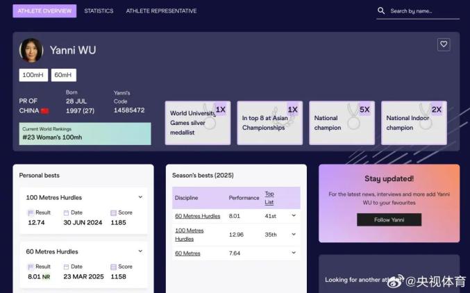 5月8日,國際田聯(lián)最新排名公布,吳艷妮在女子100米欄項目中躍居世界第23位,創(chuàng)下個人職業(yè)生涯新高,也是中國選手在該項目中的世界排名記錄。